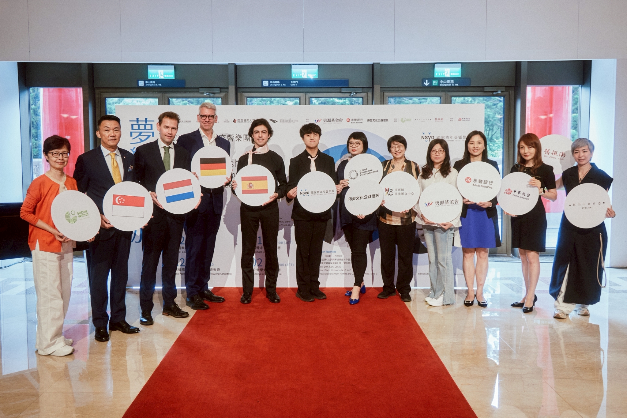 圖二、大合影(自左到右)台北歌德學院藝文活動組/陳欣蕊、新加坡駐台北商務辦事處代表 /葉偉傑、荷蘭在台辦事處代理代表/Mr. Matthijs van der Hoorn、德國在台協會行政事務處長/Mr. Johannes HARMS、NSYO中提琴團員 / París Cabezudo Alejandro、NSYO鋼琴團員 / 鄭勝豪、NSO執行長/郭玟岑、苗北藝文中心藝術總監 / 林佳瑩、勇源教育發展基金會副執行長 / 王毓麟 、永豐銀行數位金融處副總經理 / 蔡佩如 、中華航空台北分公司資深營業代表 / 蔡佩璇、方國強設計工作室總經理 / 廖雅玲