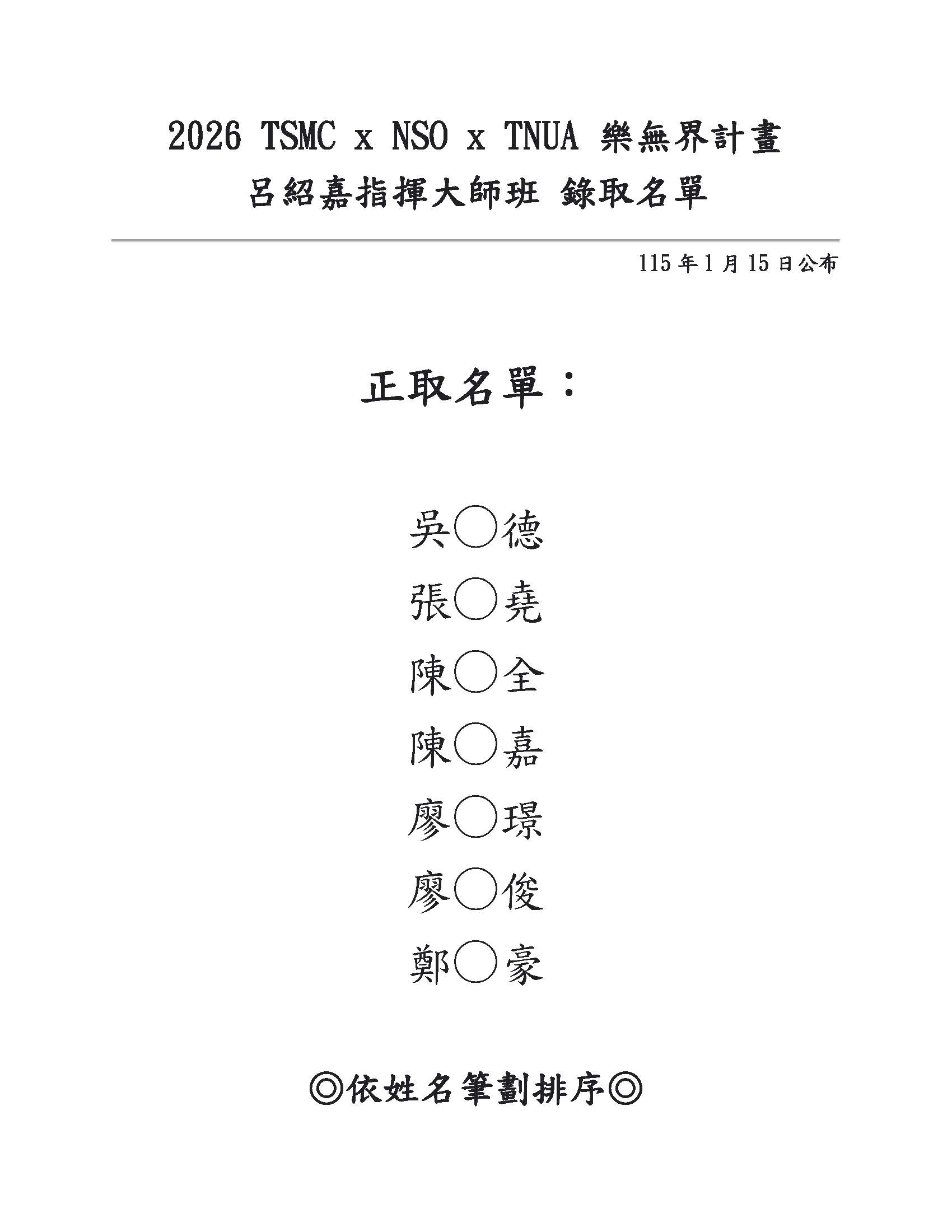 呂紹嘉指揮大師班甄選錄取名單