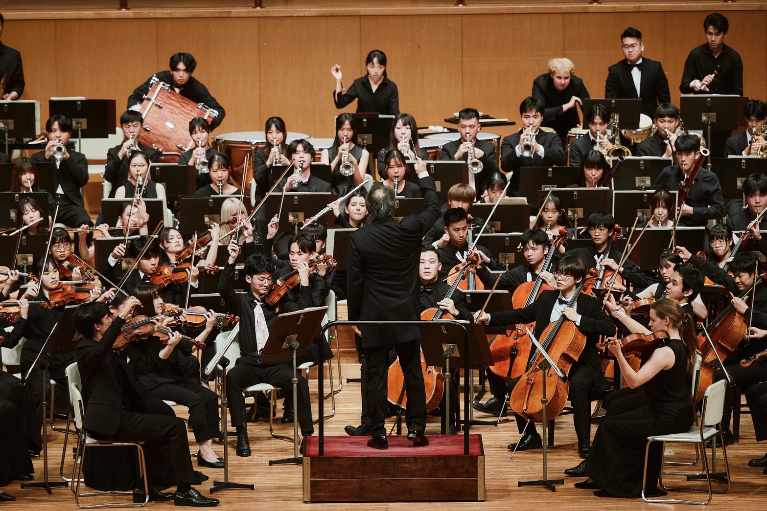 歷經近半年的籌備,國家青年交響樂團(NSYO)於2025年7月展開暑期巡演,由國家交響樂團(NSO)音樂總監準.馬寇爾(Jun Märkl)率領,自臺灣北、中、南三地起步,並於8月1日首次登上海外國際規格的舞臺——橫濱港未來館音樂廳。今日(8月2日),NSYO更與日本國立音樂大學管絃樂團於東京攜手合作,在熱烈的掌聲中,為五場巡演旅程劃下圓滿句點。東京壓軸場地為日本國立音樂大學音樂廳,隸屬於今年迎來創校一百週年的國立音樂大學(1926年創立,原為東京高等音樂學院)。近一個世紀以來,該校培育出無數知名演奏家、教育家與音樂文化專才,對日本音樂發展影響深遠。此場音樂會亦是該校百年系列活動之一,別具紀念意義。音樂廳出自同樣負責東京文化會館設計的日本戰後現代主義建築大師前川國男(まえかわ くにお)之手,典雅的朱紅色建築外觀並兼具當代音樂廳所需的功能性,不僅是日本音樂教育與演出的重要據點,也持續成為國際音樂交流的重要平台。